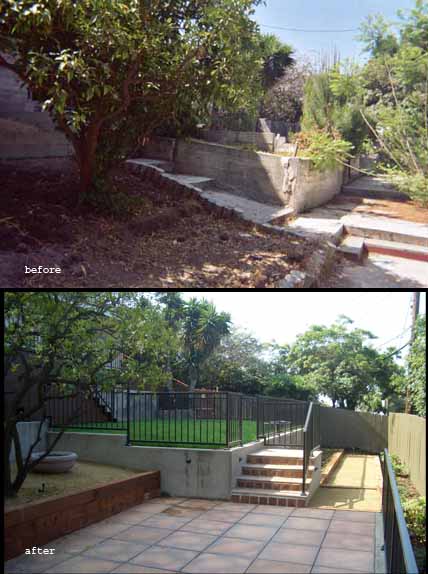 From disaster to Mediterranean oasis. This garden features new decks, play lawn, vegetable beds, built in bbq, fire-bowl, decomposed granite and tile patios, and low voltage lighting. Photos above show part of the transformation – we kept the mature orange tree in the foreground, but everything else is brand new.