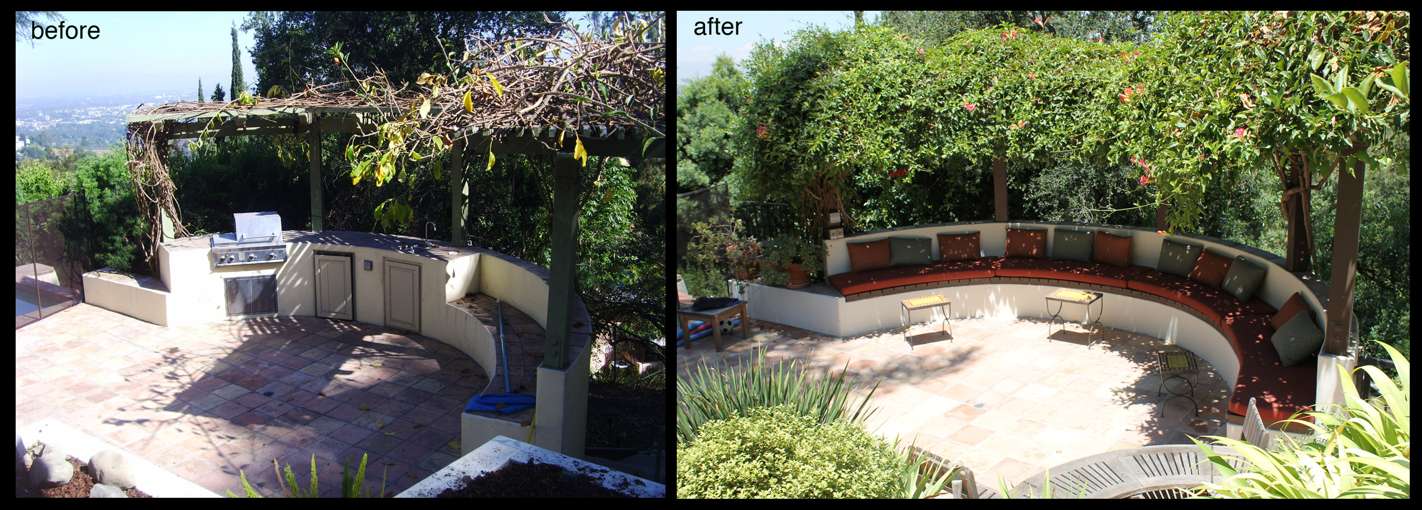 We transformed this unused outdoor kitchen into a comfortable, shaded seating area.