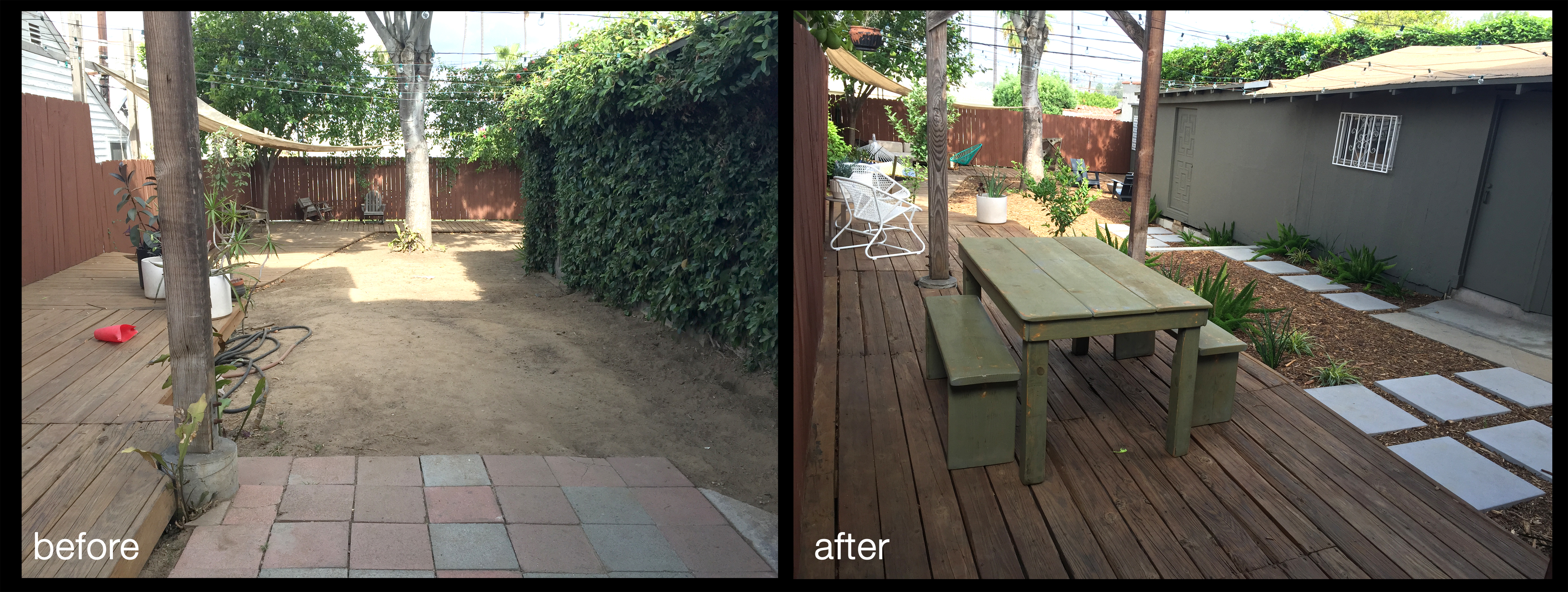 Starting with: bare dirt, wild vines, and existing decks.