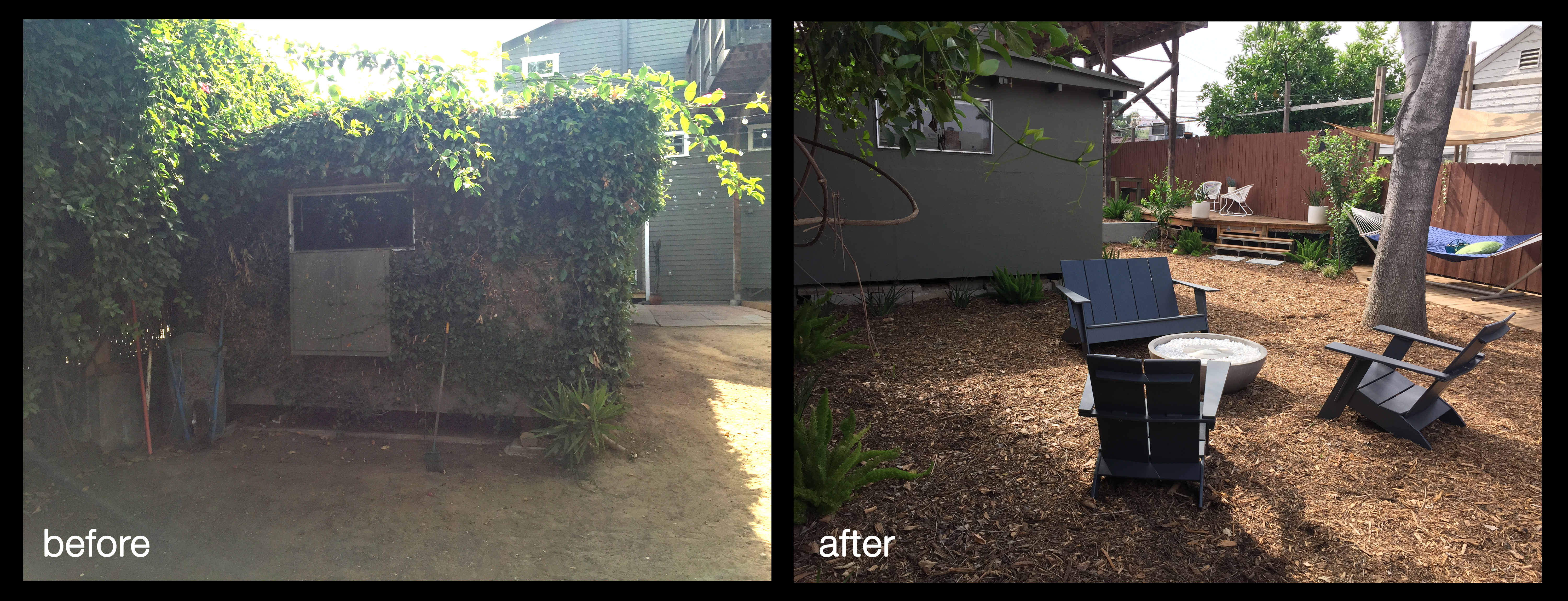 What did we design? First, we worked out the grade change by adding a short garden wall and steps and cleaned up the vines. Next, drip irrigation, concrete pavers and a fossil-fuel-free EcoSmart firepit created outdoor living spaces, which needed some new outdoor furniture (we love Pot-Ted!).